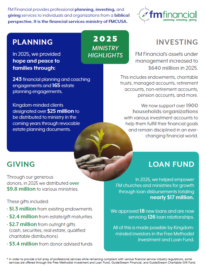 As our team looks back on the activities of 2025, we are thankful for the trust you placed in us to help you plan with purpose, invest with discipline, and give with joy. Numbers never tell the complete story. It is our prayer that each number represents more HOPE, PEACE, and JOY for families and ministry organizations.